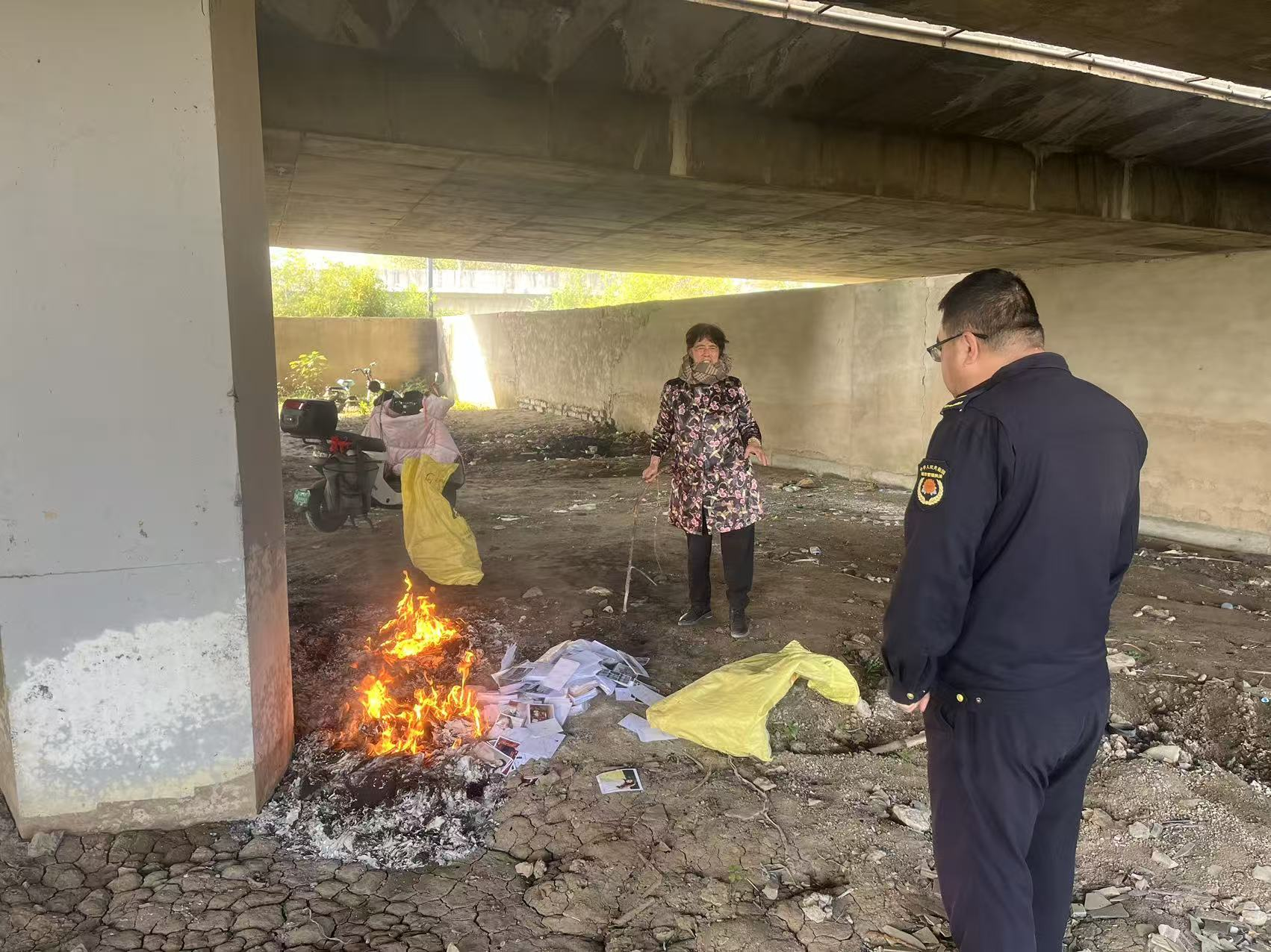 宋跳巡查中队队员在巡查过程中发现310国道桥底存在焚烧垃圾、杂物行为,第一时间与当事人讲明利害关系,告知焚烧违法行为存在安全隐患,通过教育劝阻有效遏制了焚烧态势蔓延。