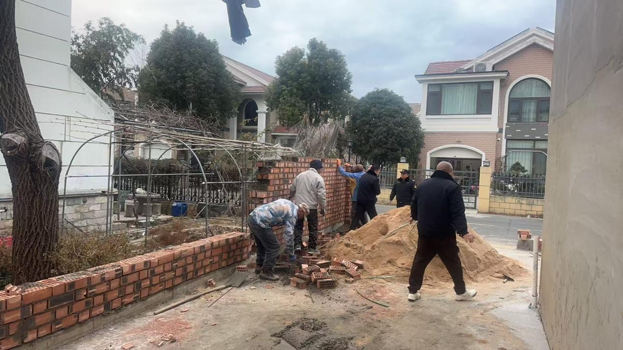 经调查核实,云顶华庭小区该户业主在未取得任何建设工程规划审批手续的情况下,擅自砌筑一处长约15米、高1.8米的砖石围墙,不仅占用了小区公共通道及绿化区域,还影响了周边居民正常通行,且存在消防安全隐患。新浦工业园城管中队坚持柔性执法原则,多次与涉事业主沟通,耐心宣讲违法建设的危害,随后安全规范地完成拆除工作。
